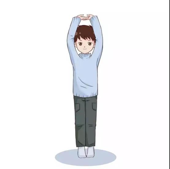 1.双手十指交叉上举、脚跟提踵拉伸(4x8拍)
