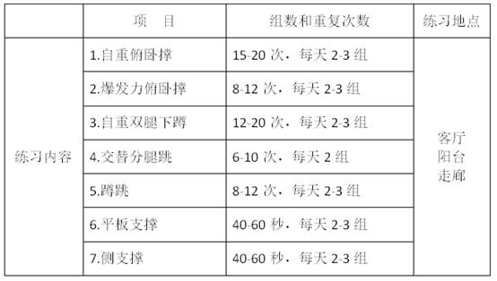 当前,正值新型冠状病毒感染的肺炎疫情防控的特殊时期。为引导全校师生在延迟开学期间居家进行适量的体育锻炼,每天动一动,保持健康的生活方式,劳逸结合提高身体免疫力,增强健康防范能力,落实学校关于延期开学期间教学要求,最大限度减少疫情对学校体育和健康教育教学的影响,特制定居家健康锻炼指南供广大师生参考借鉴。